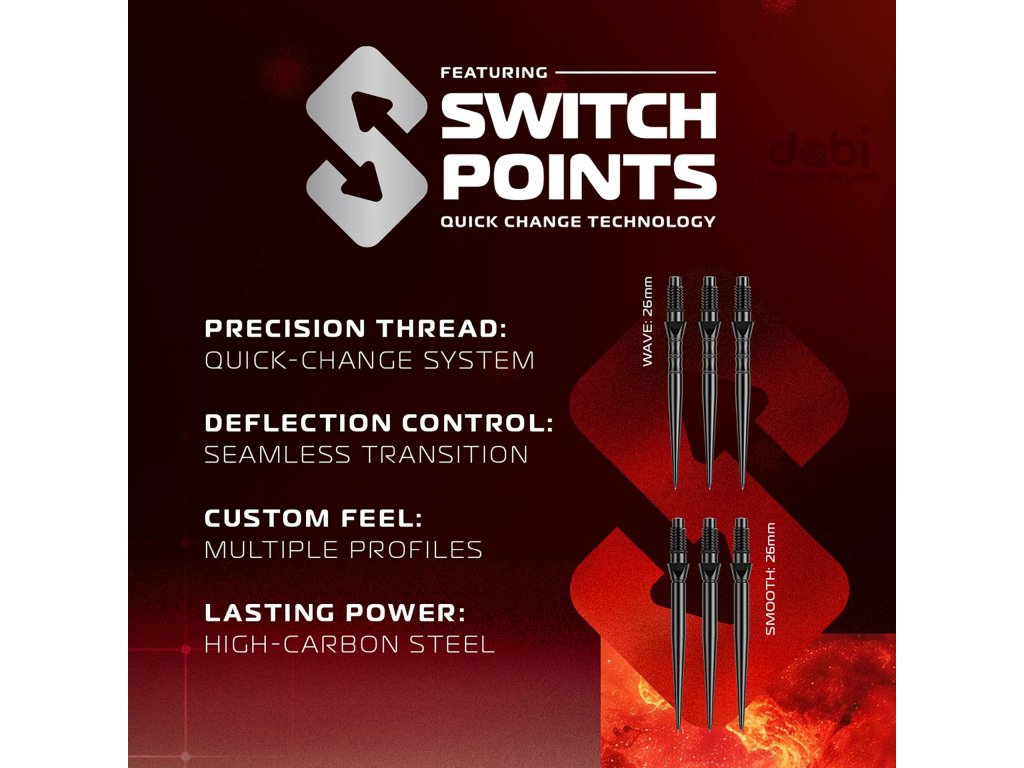 Steelové hroty Winmau Switch Points jsou navrženy pro rychlou výměnu a nelze je zaměnit s běžnými hroty pro nalisování ani s hroty se závitem 2BA.