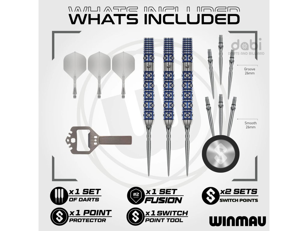 Steelové hroty Winmau Switch Points jsou navrženy pro rychlou výměnu a nelze je zaměnit s běžnými hroty pro nalisování ani s hroty se závitem 2BA.