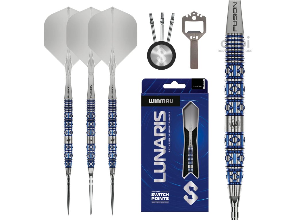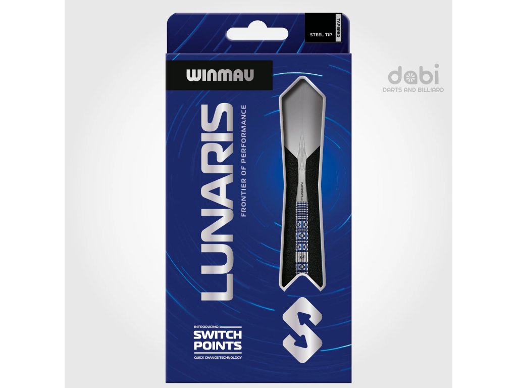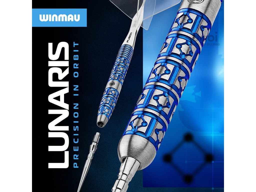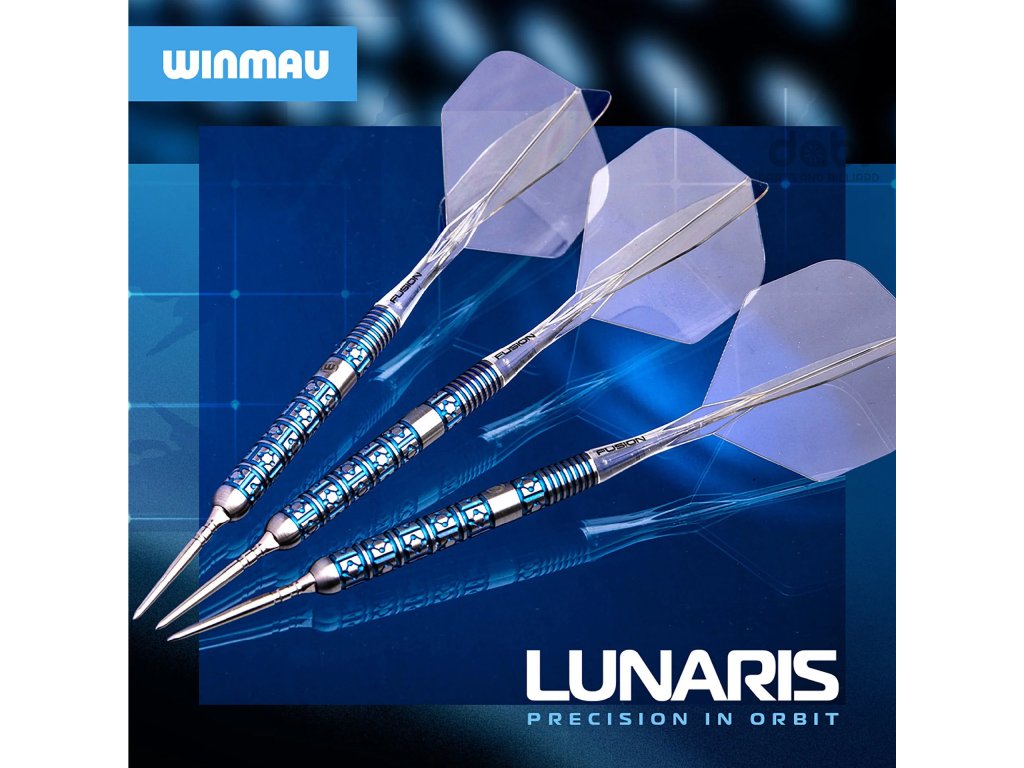 Lunaris, inspirovaný půvabnou geometrií noční oblohy, odráží uspořádání a symetrii souhvězdí Lyry, což oživuje jeho barel s diamantovým a liniovým frézováním. Design poskytuje jistý úchop, konzistentní kontrolu a modrý vizuál s funkčním kroužkem v zadní části. Šipka Lunaris je vybavena inovativními systémy Fusion a Switch Point od společnosti Winmau a nabízí naprostou přizpůsobivost. Technologie Fusion zlepšuje kontrolu nad hodem, zatímco Switch Points umožňují rychlé změny hrotu. S několika profily úchopu navrženými pro různé styly házení poskytuje Lunaris každému hráči perfektní pocit.