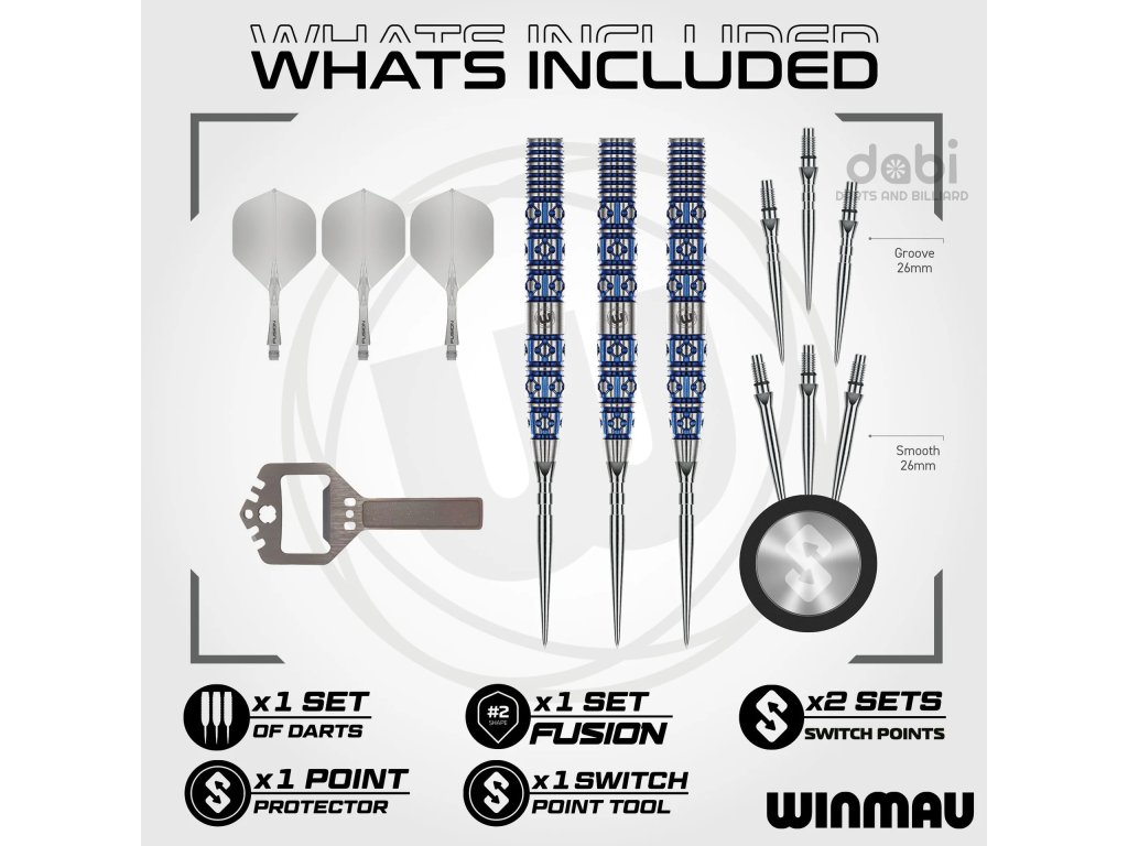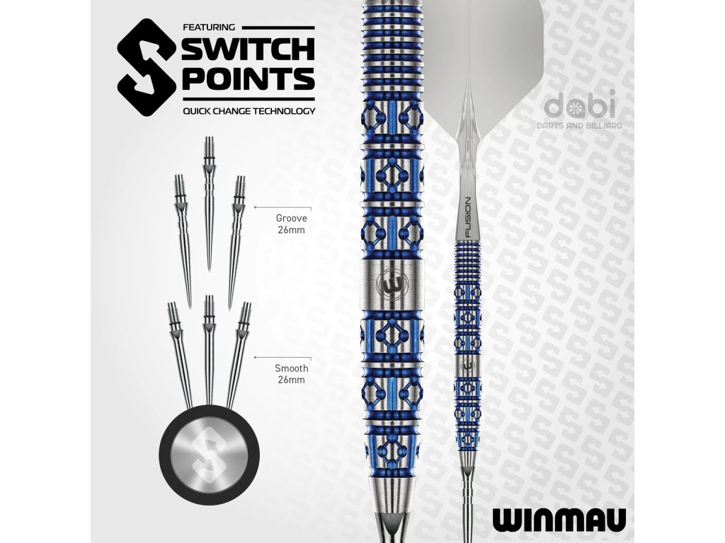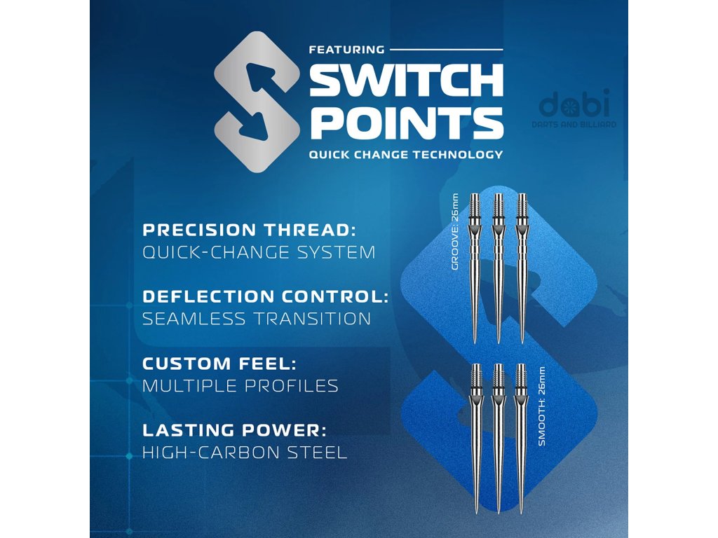 Steelové hroty Winmau Switch Points jsou navrženy pro rychlou výměnu a nelze je zaměnit s běžnými hroty pro nalisování ani s hroty se závitem 2BA.
